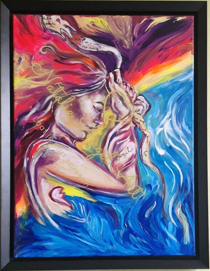 In this painting i put past paintings together to form one piece. Its about trying to release past trauma.